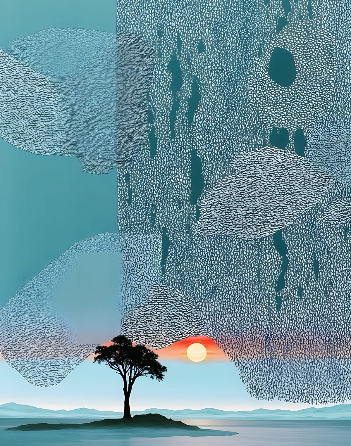 This image presents a low-light mountain lake scene, combining abstract painted collage elements with photographic detail in a modern 2025 artistic style. Mixed media techniques are evident.