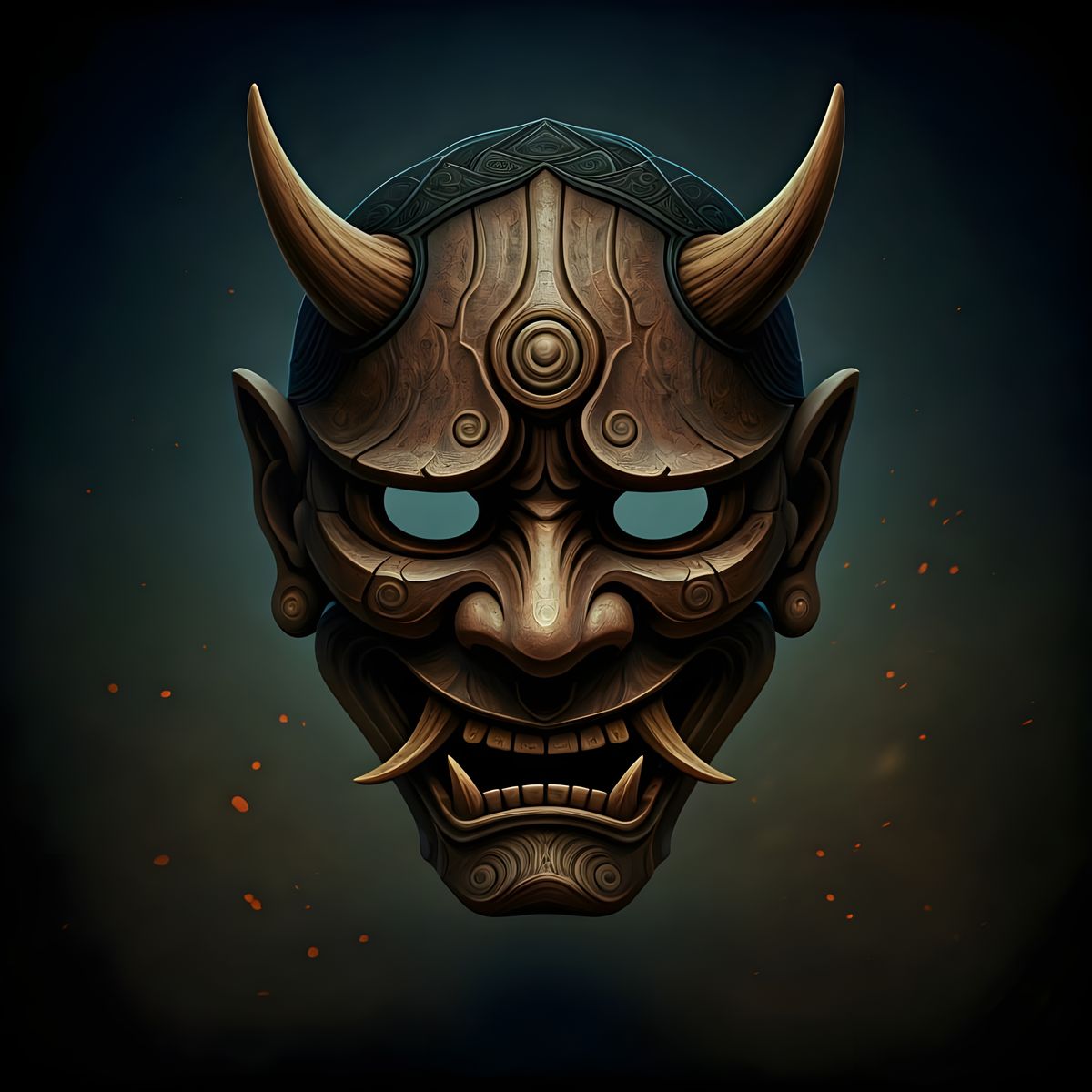 A dramatic, high-contrast image of a rough-hewn oni mask, set against a rich, vibrant background with intricate carvings and hyperdetailed textures, reminiscent of masterful chiaroscuro and medieval art techniques.