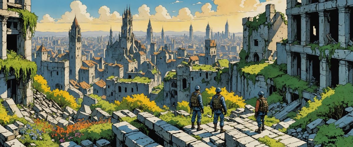 A vibrant watercolor and gouache image of soldiers overlooking the overgrown ruins of a modern city. The scene is bathed in the warm light of the late day sun, creating a chiaroscuro effect.