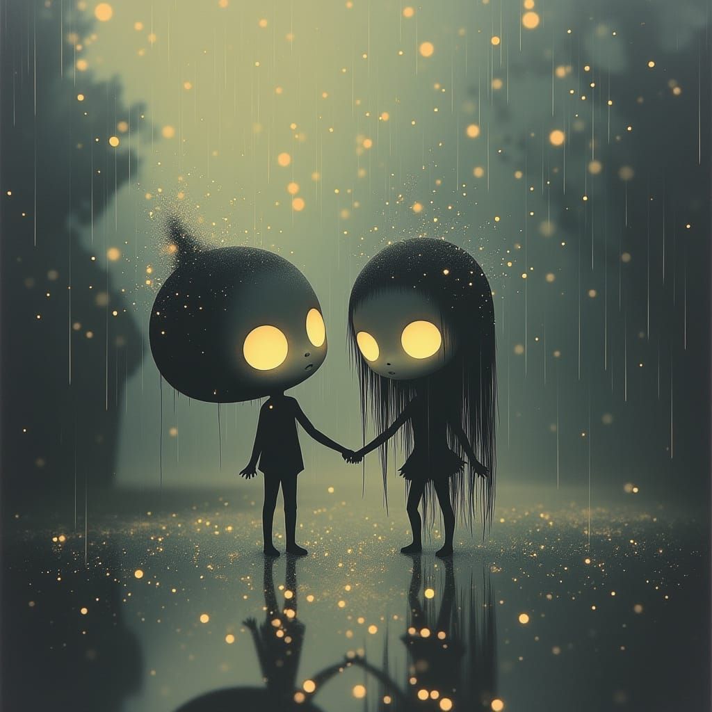 This image shows a cute chibi spectral couple with exaggerated forms dancing in a whimsical, mist-filled graveyard. The art style features painterly brushstrokes and soft textures, creating an eerie yet playful mood.
