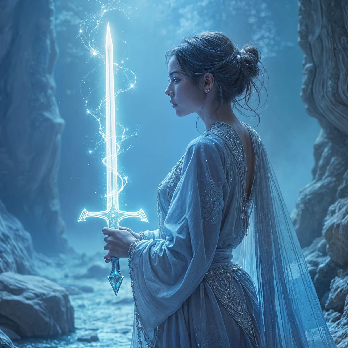This enchanting image depicts a mystical sorceress summoning Luxcinder, a slender, crystalline sword radiating a vibrant cerulean glow that dissolves shadows. The sword's sleek design and intricate Art Nouveau patterns evoke an otherworldly essence, set against a luminous gradient of pale blue to silver ...