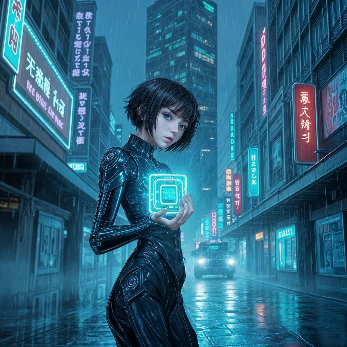 A close-up of a cyborg woman in a neon-lit, rain-slicked street. The artwork evokes a dreamy anime noir style with soft gradients, reminiscent of Studio Ghibli.