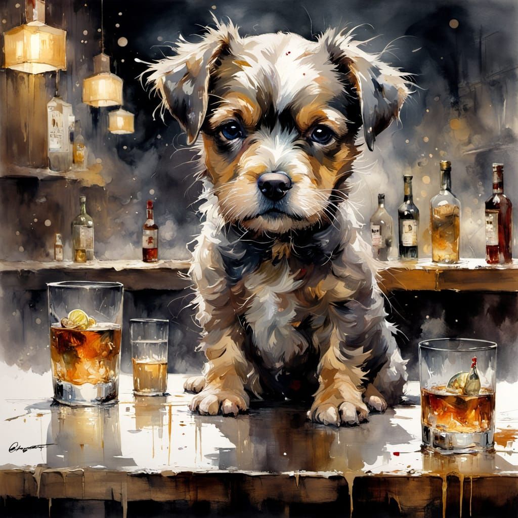A puppy drinking whiskey and feeling lonely at a bar alone on new years eve. insanely detailed watercolor painting with rough paint strokes and textures, by Pino Daeni, Jeremy Mann, Carne_Griffiths, Wadim Kashin, James Gurney, 16k resolution, fine art, super dramatic light, beautiful