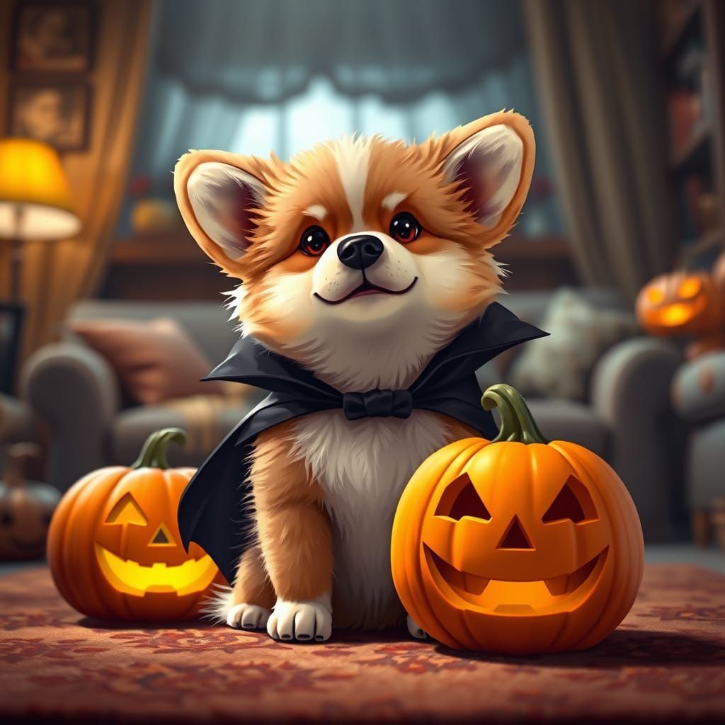 This image shows a cute corgi dressed as a vampire, sitting by a jack-o'-lantern. It's a whimsical digital artwork with a festive Halloween theme.