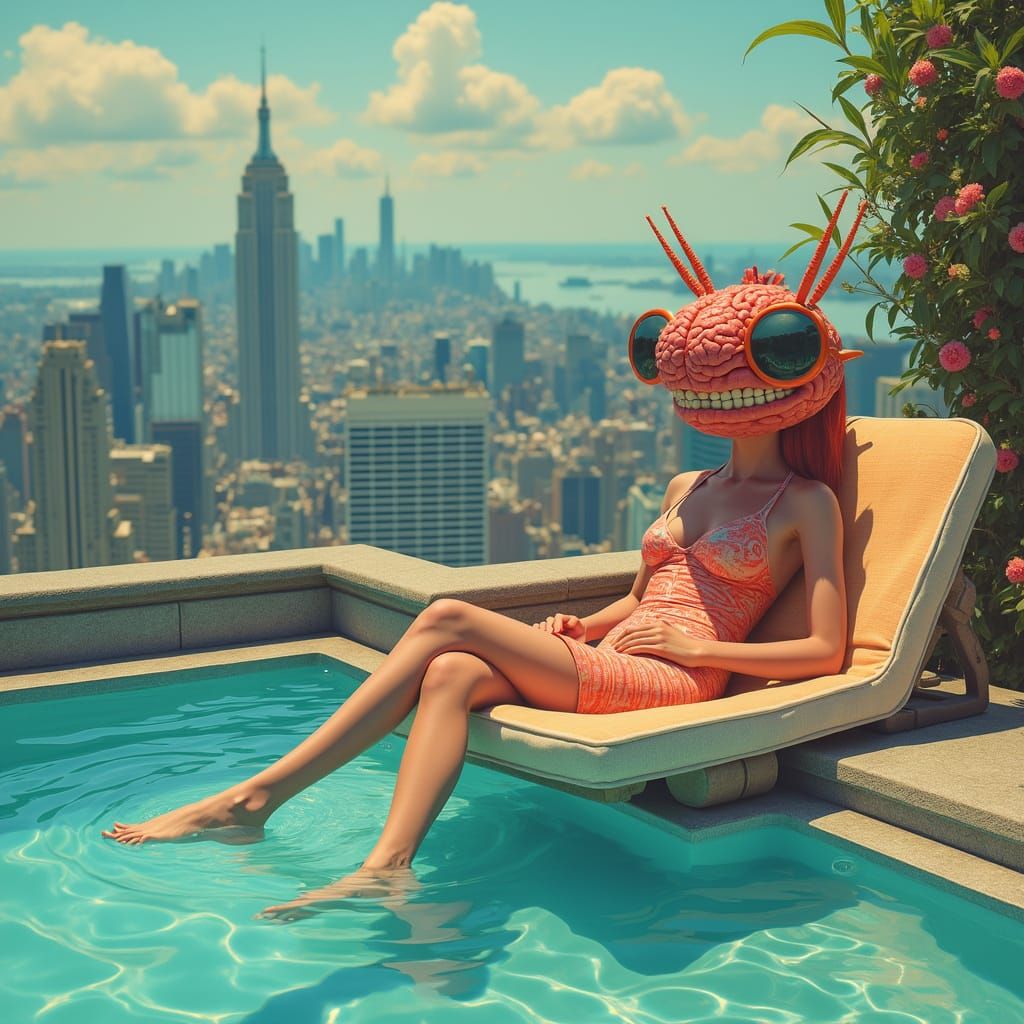 This image depicts an anthropomorphic brainrot character with sunglasses relaxing on a rooftop pool deck overlooking a vibrant, futuristic New York City skyline. The art style blends digital painting and graphic design with bold colors.