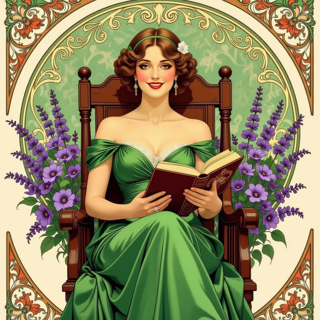 A captivating image of a woman seated in a rocking chair, reading a book. She is adorned in an emerald dress and surrounded by purple flowers, rendered with rich textures in an art nouveau style.