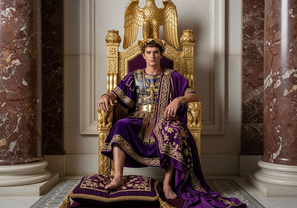 This image shows young Emperor Nero barefoot on a marble and gold throne in an opulent throne room. He wears a purple and gold toga, a wreath crown, and jewelry, with his feet resting on a purple pillow. The scene is brightly lit, captured in a realistic photography style.