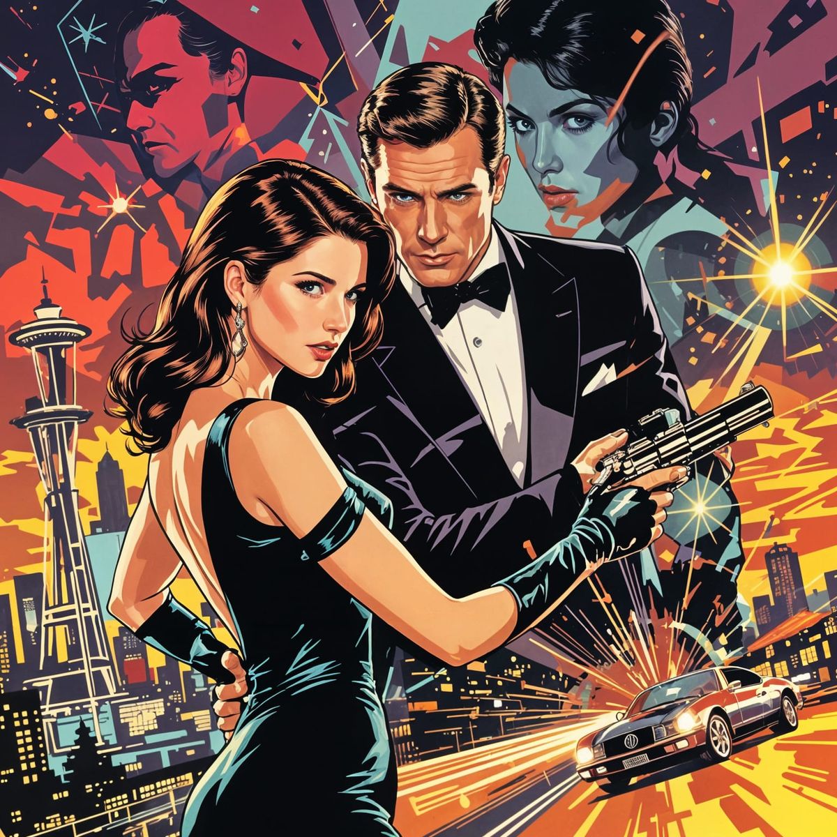This image depicts Anna Kendrick reimagined as James Bond, styled as a 1990s movie poster set in Seattle, with a comic book art influence.