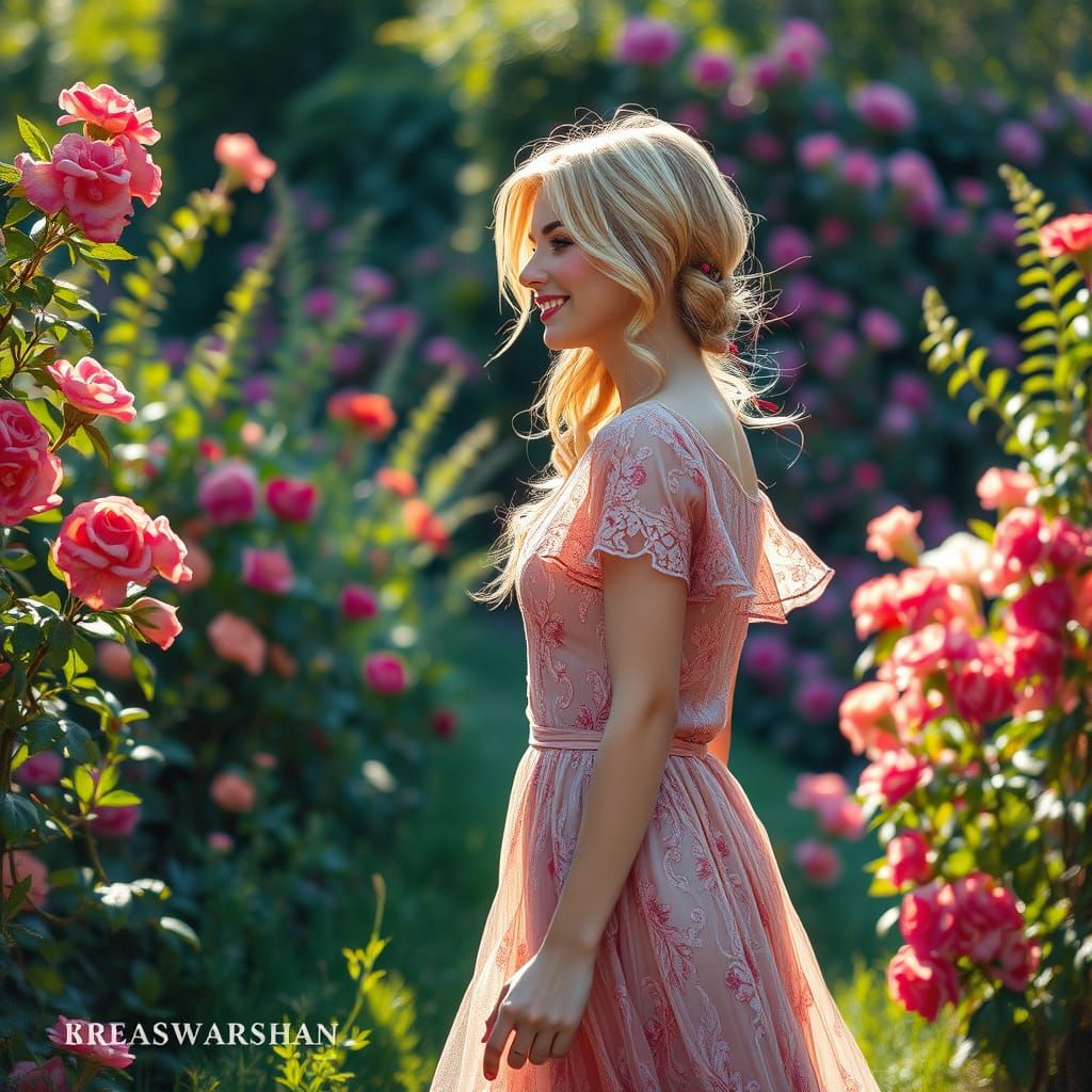 A serene portrait of a blonde woman in a rose-colored floral dress, walking towards a lush garden in soft sunlight, evoking the dreamy landscapes of French Impressionism and Art Nouveau's flowing lines.