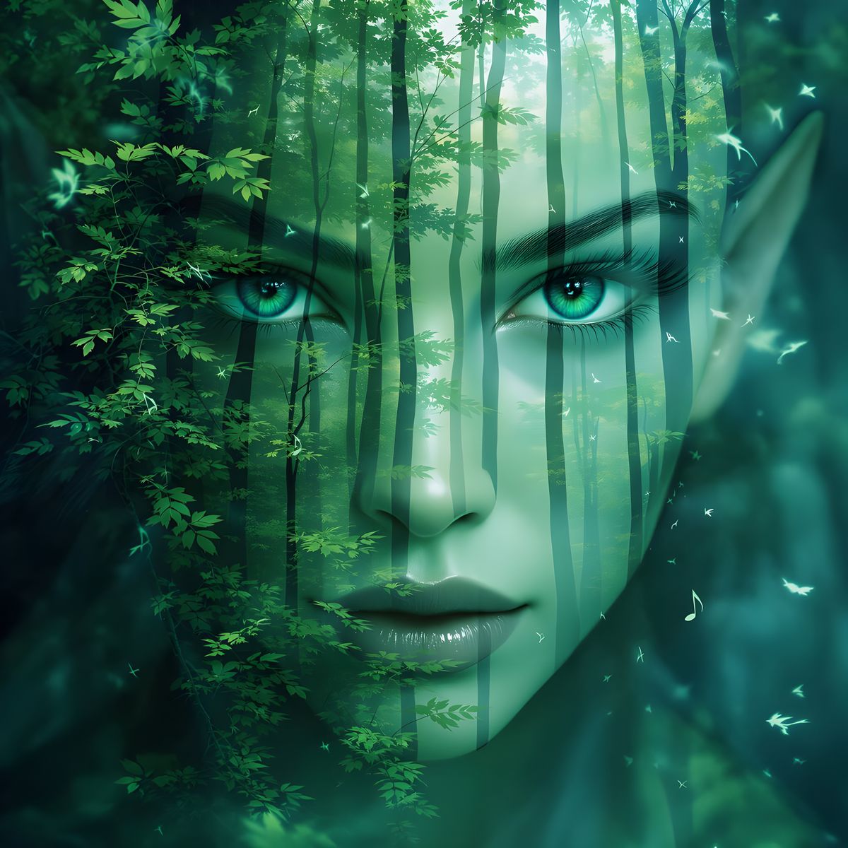 A striking 3D portrait of a colossal tiefling woman with green and blue hues. Her eyes reflect a woodland scene filled with music sheets, rendered with deep focus and atmospheric fog.