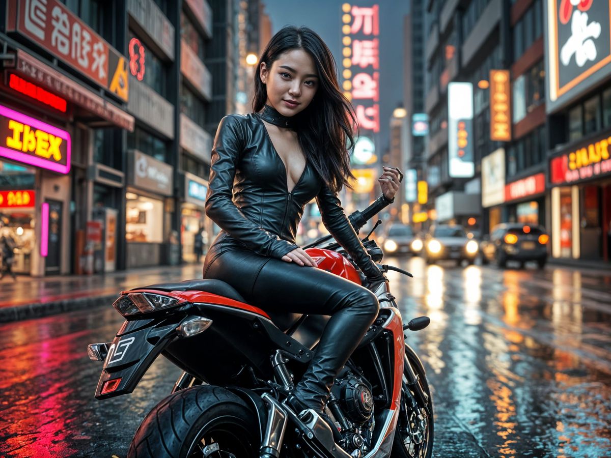 A striking image of a young woman in a cyberpunk city, sitting on a neon-lit motorcycle, wearing a sleek black leather catsuit and flat shiny boots. Rendered in a cinematic film style with film grain and color grading, evoking a sense of epic drama and stunning visuals.
