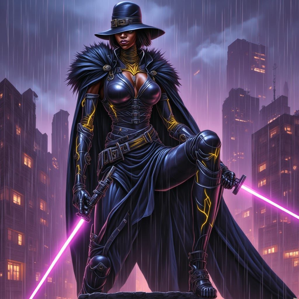 A striking picture of a black female cyborg Jedi in a cyberpunk metropolis. She is perched on a skyscraper, wearing battle-worn armor and wielding a purple lightsaber, in a cyberpunk aesthetic.