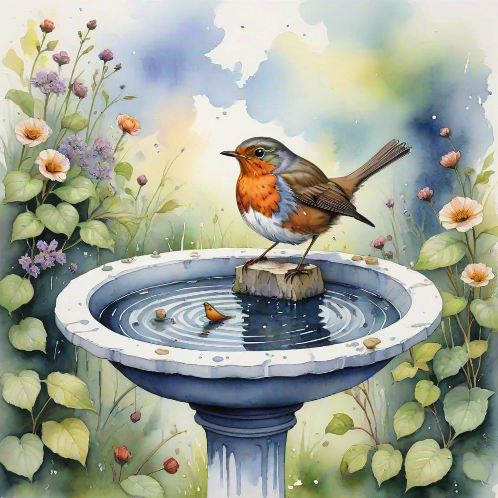 This image shows a robin enjoying a birdbath, rendered as a pen and watercolour artwork. The delicate lines and soft washes of color create a charming, natural scene.
