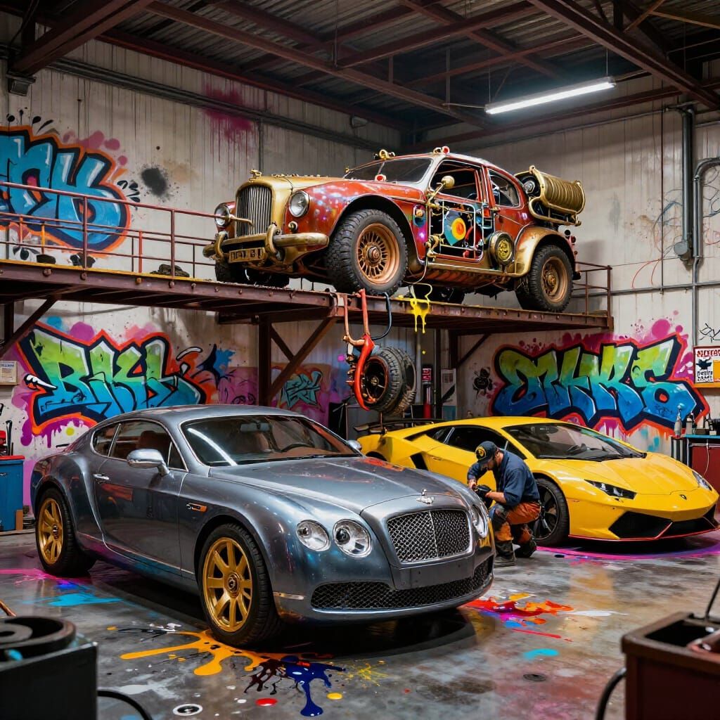 A highly detailed image of a futuristic garage featuring a steampunk car on a workshop bridge, with Bentley and Lamborghini vehicles. A mechanic is working on a tire. The art style is vibrant and high-contrast, resembling street art with oil and acrylic techniques.