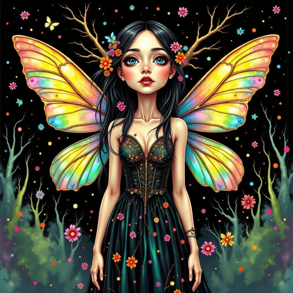 This toonish comic style image features a melancholic gothic fairy with abstract, elongated form and striking, kaleidoscopic dragonfly wings in vivid colors. Her dress shows elements of decay and elegance.