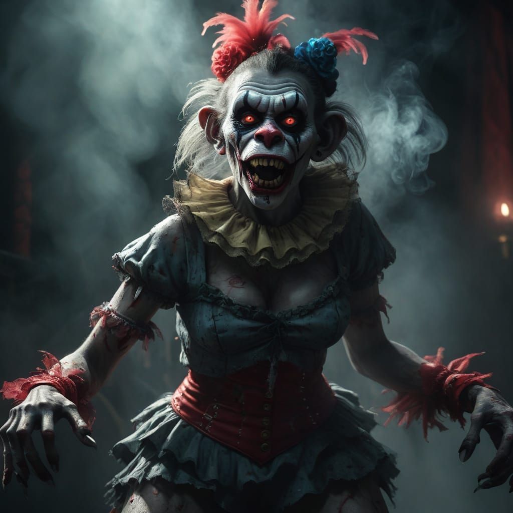 This image shows a zombie monkey clown performing on stage. The dark fantasy art features vibrant colors, ominous shadows, glowing red eyes, and a sinister grin, rendered with high detail and contrast.