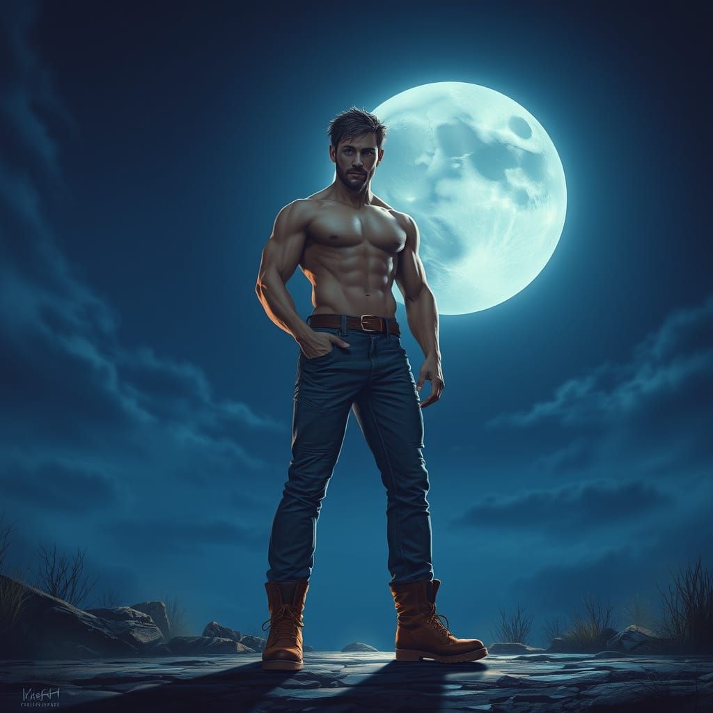 A captivating image of a muscular man standing alone under a serene moonlit sky. The scene evokes mystique with atmospheric lighting and intricate details, in a digital art style.