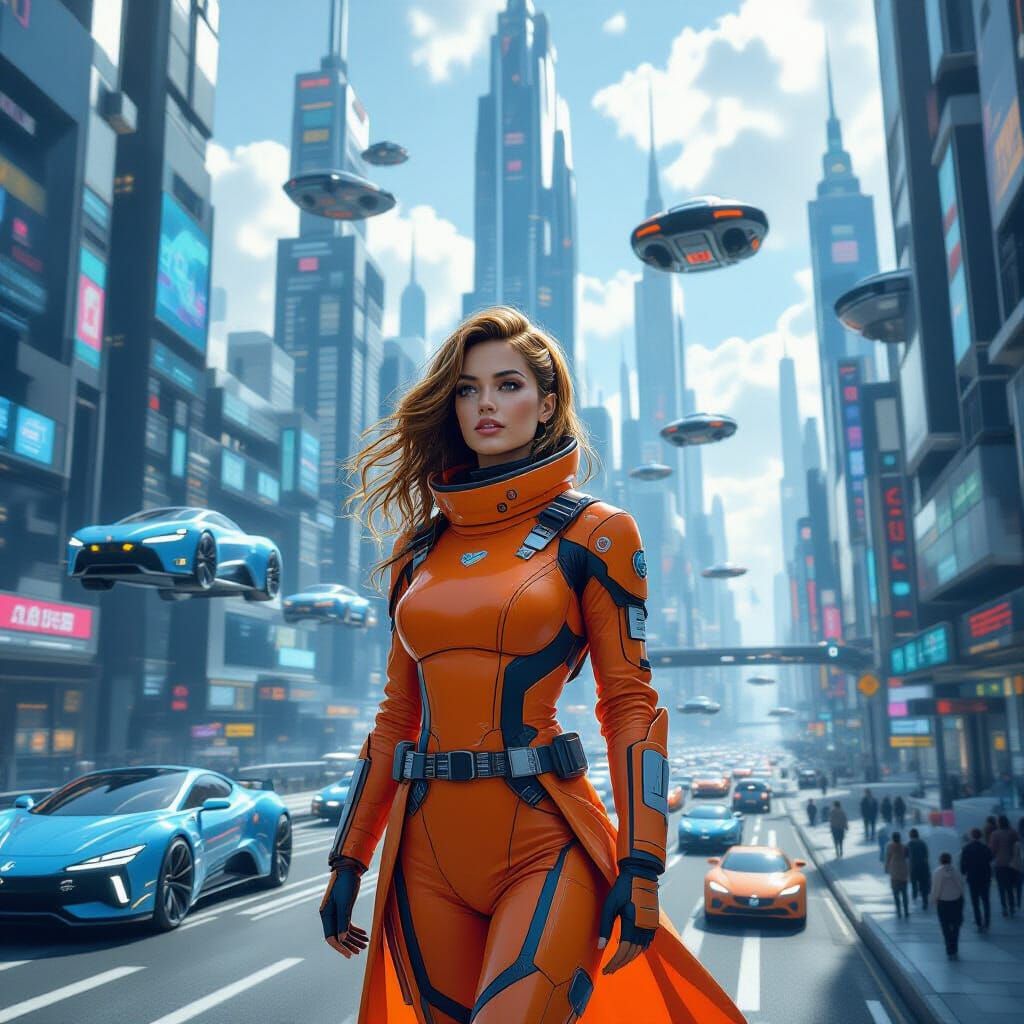 A vibrant futuristic city with towering skyscrapers and busy floating traffic, featuring a striking woman in an orange space suit as the focal point. The image blends sci-fi elements with a captivating character.
