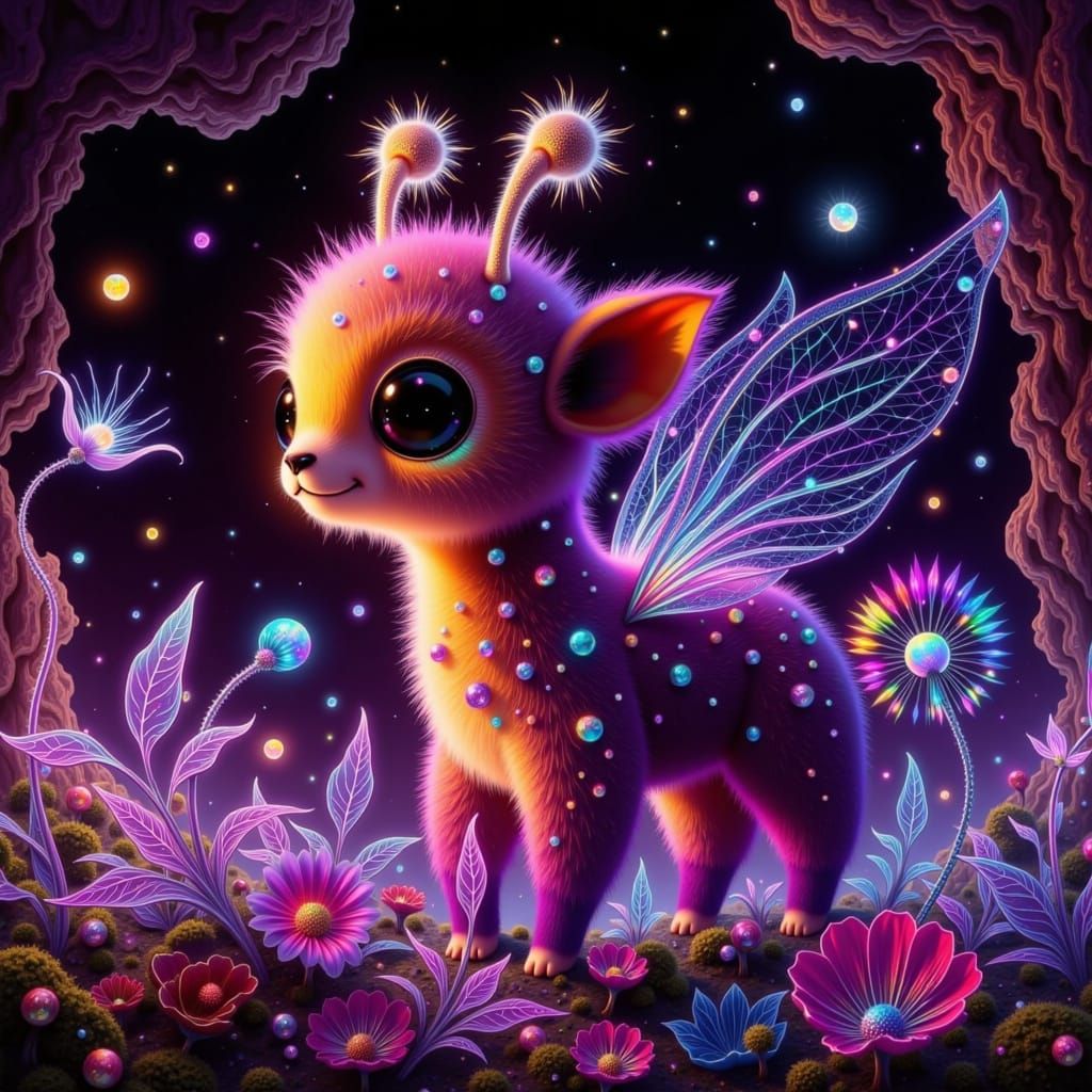 This image shows a miniature, winged giraffe with rainbow metallic fur and large, shimmering eyes, perched amid glowing plants inside a crystal cave. The artwork features vibrant colors and ethereal lighting.