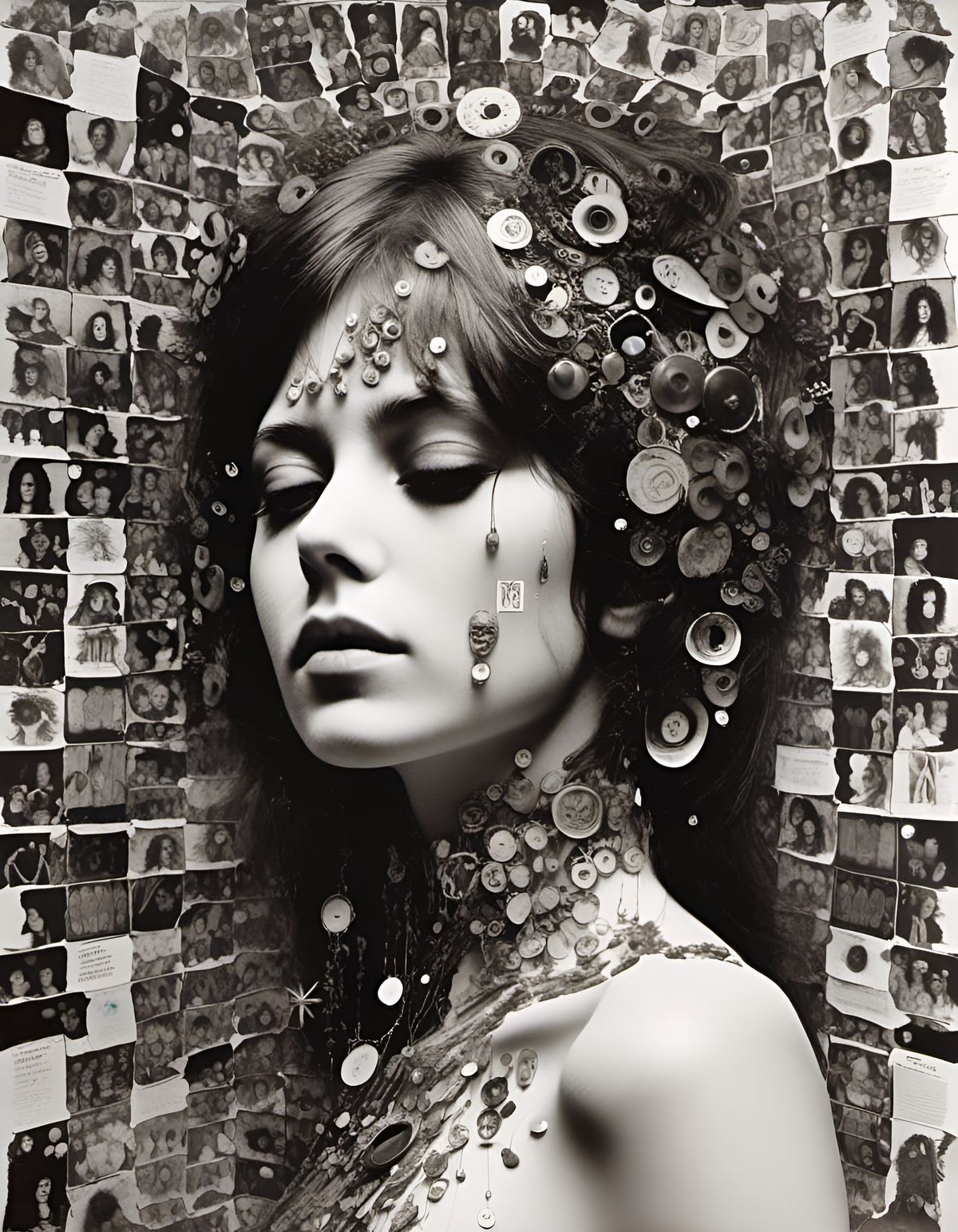 A black and white collage-style album cover featuring a woman's head and torso. This artwork evokes a vintage feel with its cut-out aesthetic and tiny details.