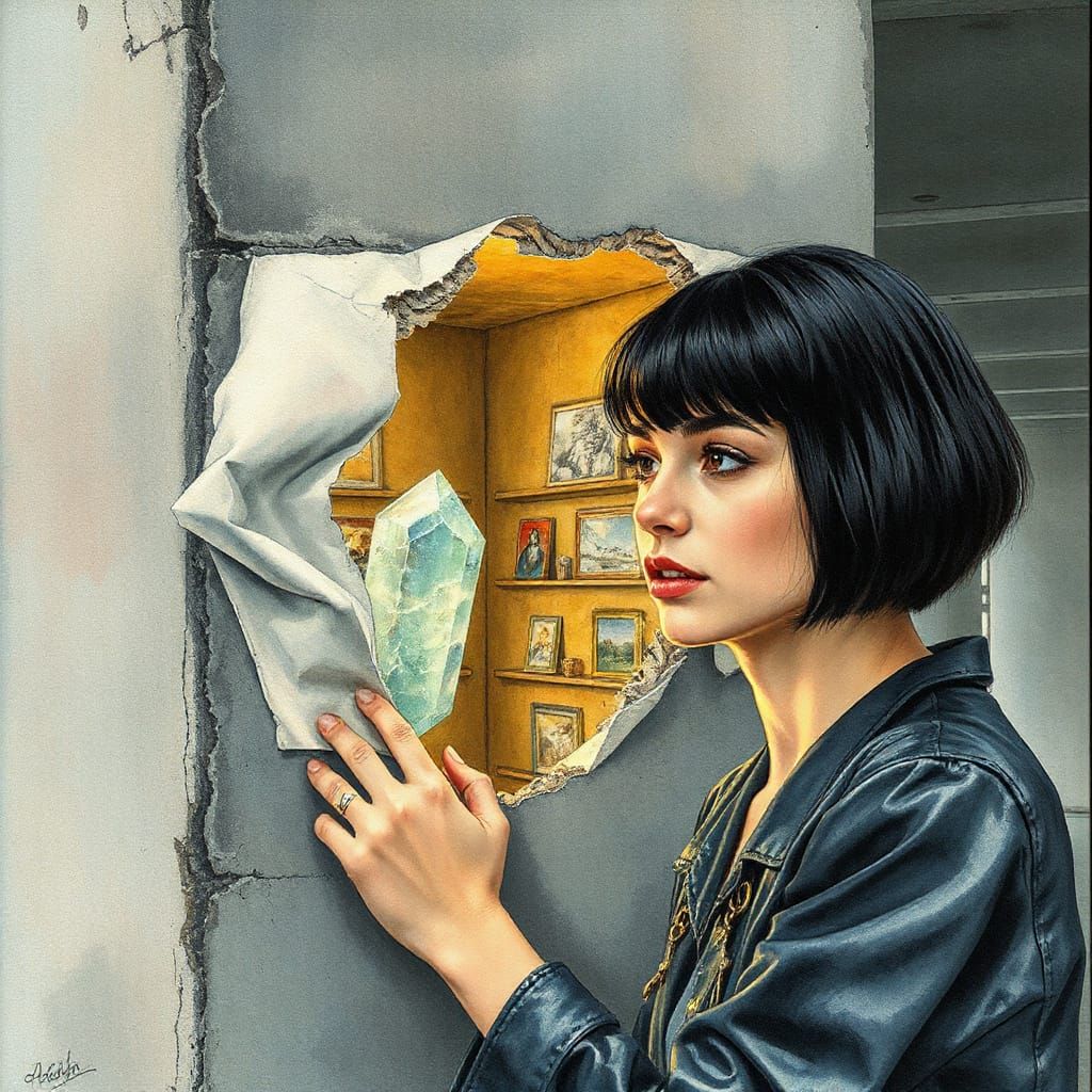 A striking picture of a young woman discovering a miniature art gallery hidden within a city's infrastructure. The artwork is created in a magical realist watercolor and ink style. Bioluminescent paintings adorn the gallery walls.