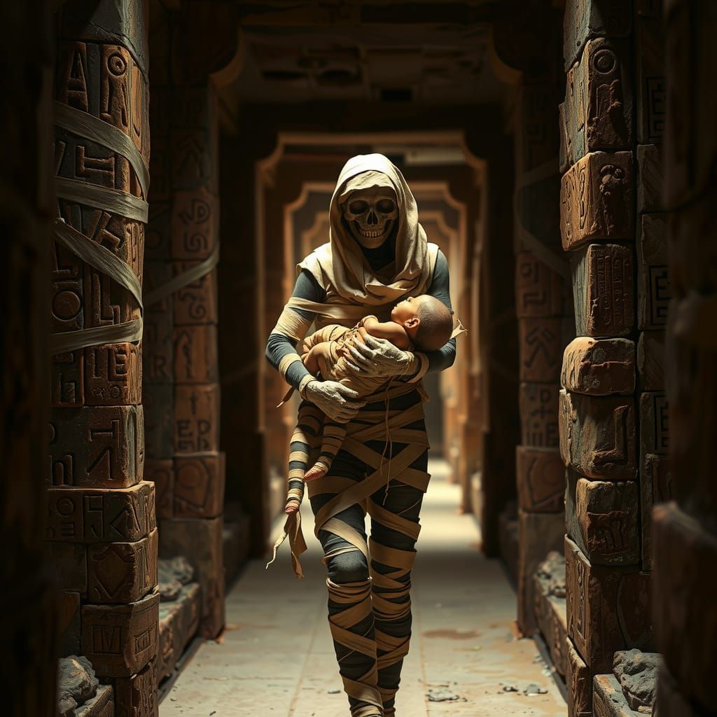 This image shows a female mummy walking through an Egyptian tomb. She is wrapped in bandages and cradling a mummified infant in her arms, deep within the ancient corridor.