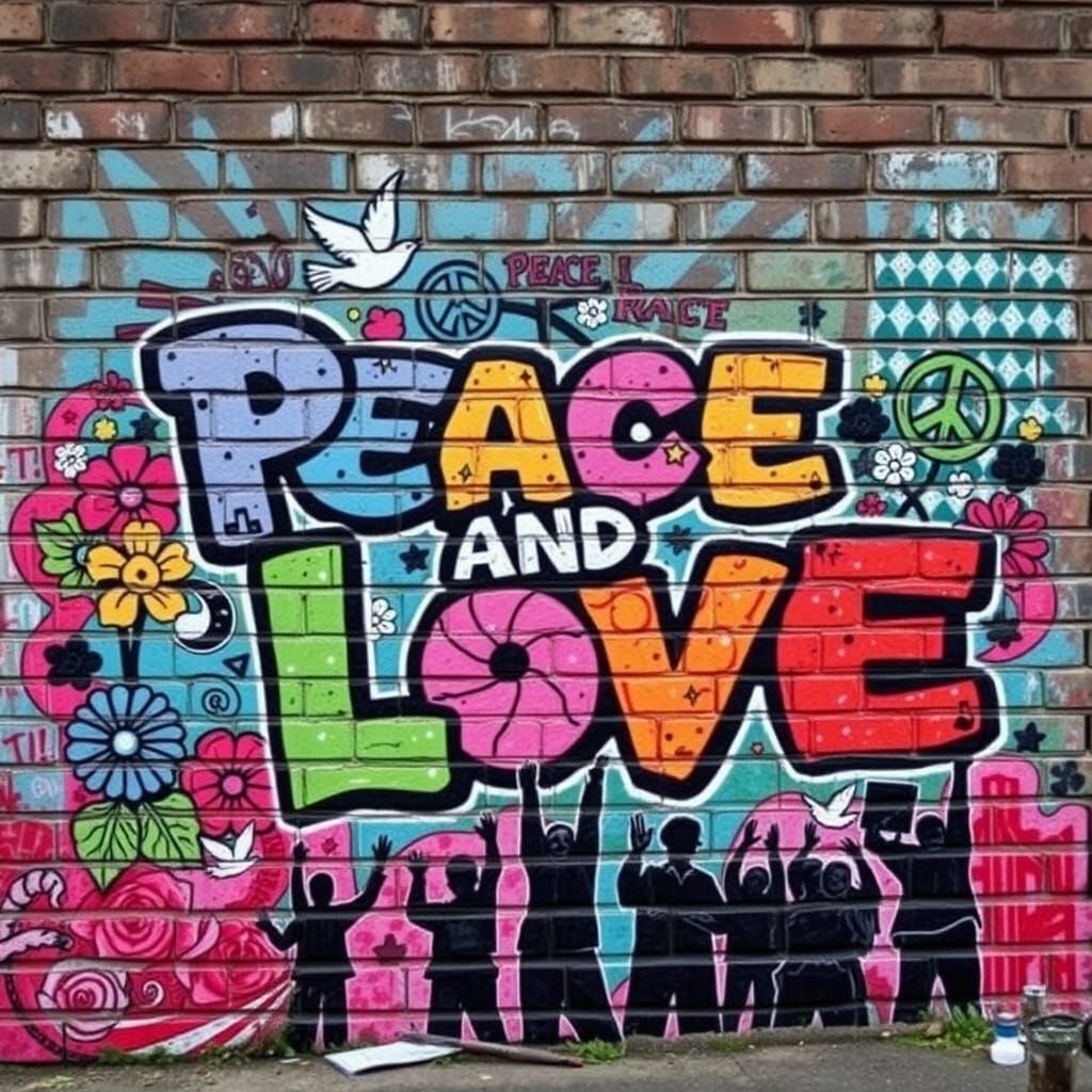 This image shows a graffiti mural with the words "Peace and Love" painted on a brick wall. The artwork features psychedelic patterns and protestor silhouettes in an urban style.