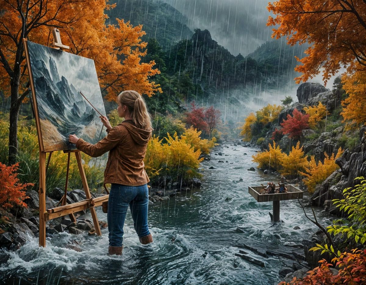 This cinematic film still shows a female artist's masterpiece come to life, as a stormy landscape bursts forth from her canvas, blending cinematic lighting, film grain, and vibrant colors to create a dramatic and epic scene.