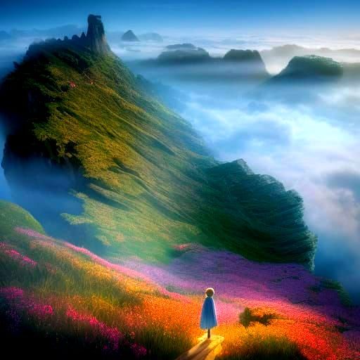 "A lone figure in a flowing robe stands at the edge of a glowing cliff under a vast twilight sky filled with stars. A soft wind carries flow...