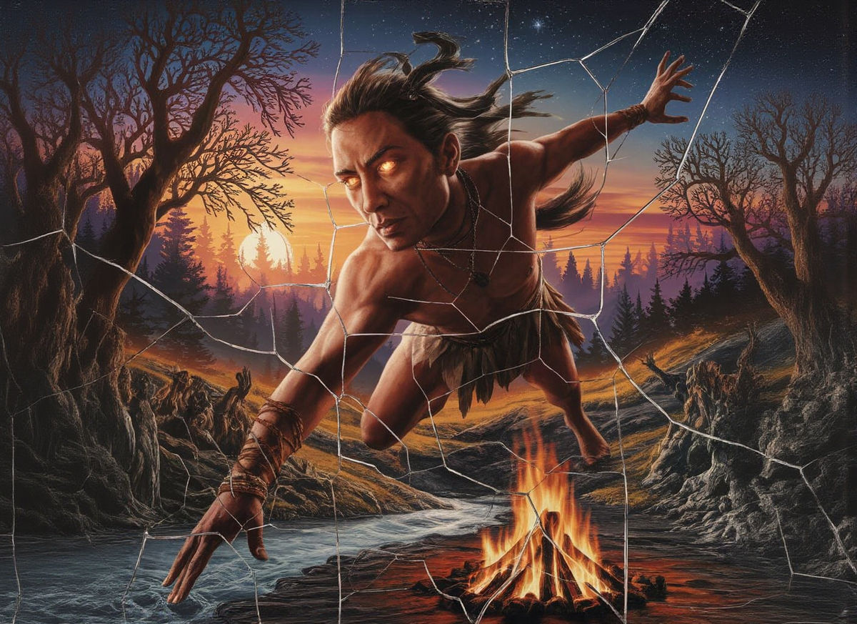 This image features a mystical tribal shaman in a dynamic pose, set against a prehistoric forest backdrop at dusk. The composition includes fantasy landscapes, liquid chrome elements, and intricate details evoking a fairytale atmosphere.