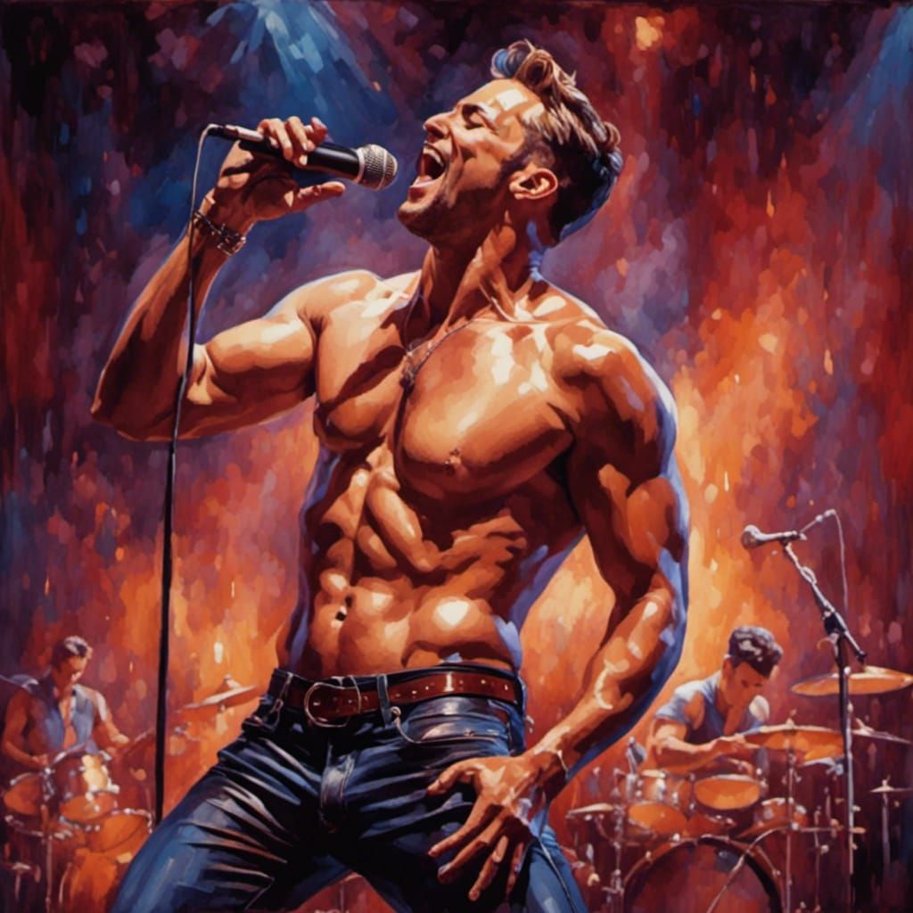 A hyperrealistic image of a shirtless singer performing on stage. Bathed in sweat, the muscular man exudes passion, amplified by dynamic lighting and a retro rockabilly aesthetic.