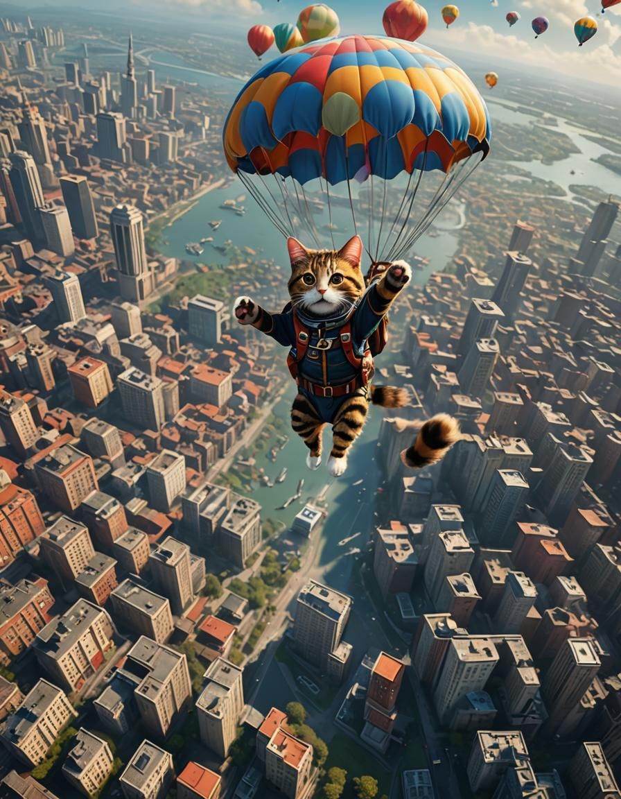 This image shows a cat engaged in a parachute jump. It features deep colors, intricate details, and complementary color schemes, rendered as fantasy concept art in 8k resolution.
