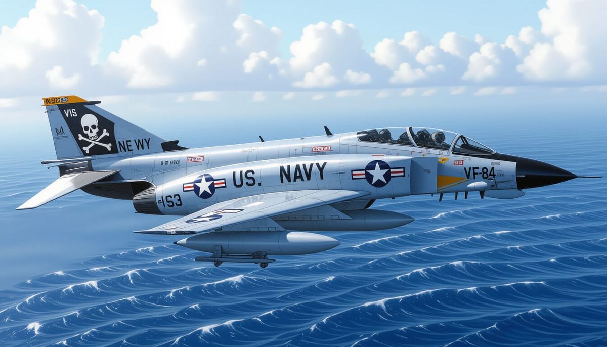 This image shows a US Navy F-4S Phantom II from the VF-84 Jolly Rogers squadron soaring above an aircraft carrier. The fighter plane features a distinctive skull and crossbones emblem and is armed with AIM-9 Sidewinder missiles.