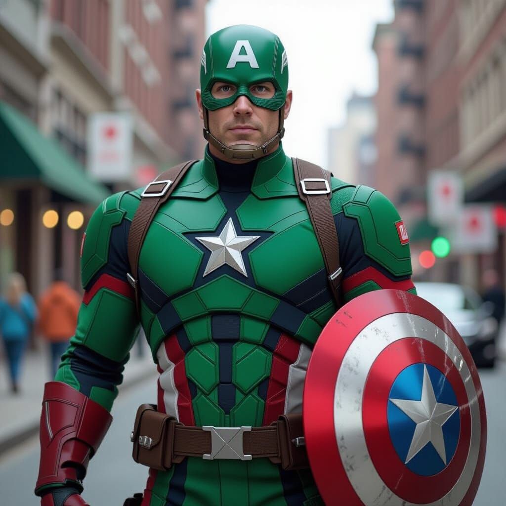 CAPTAIN AMERICA IN A NEON GREEN AND NEON ORANGE SUPERHERO SUIT.