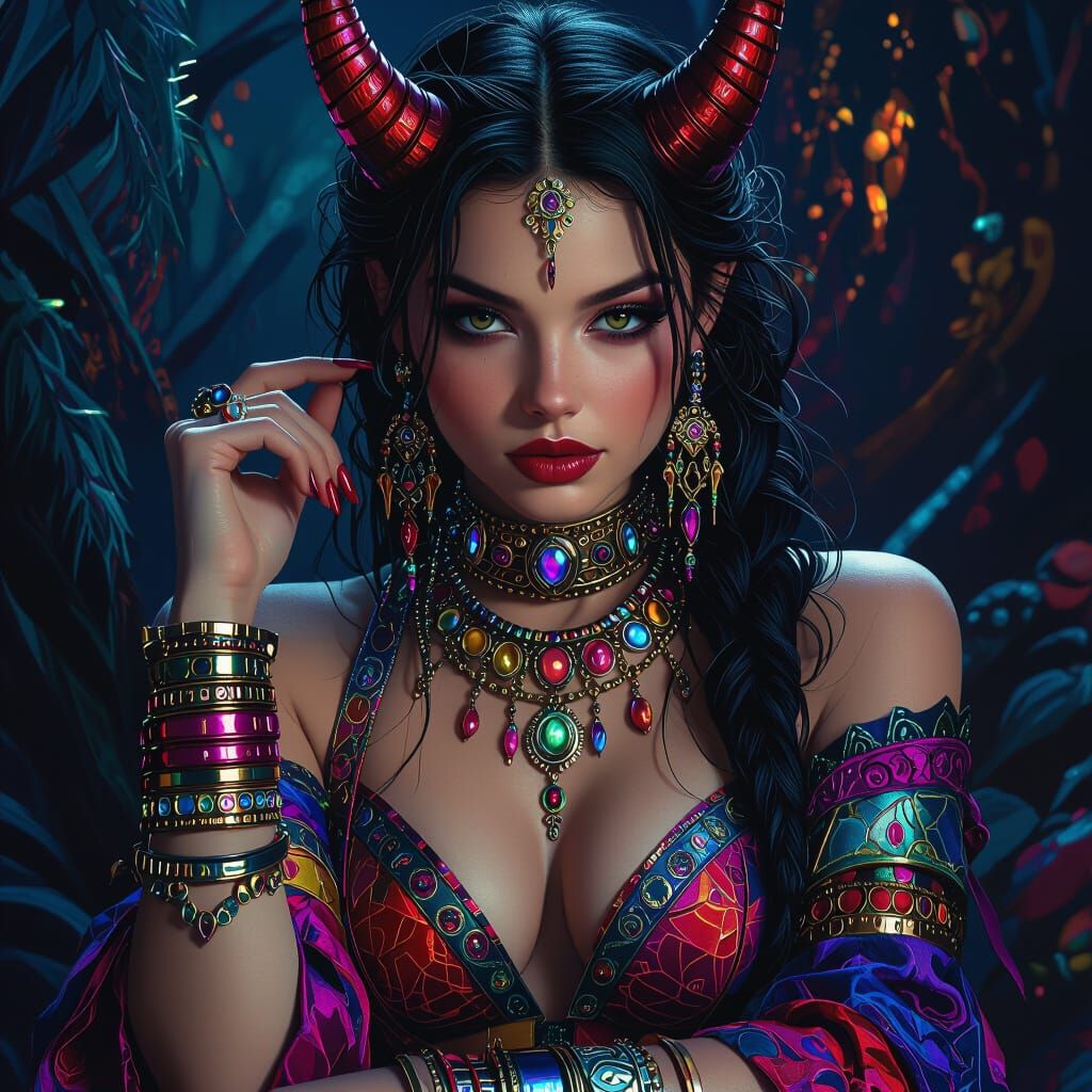 This hyperrealistic image shows a beautiful devil girl in vibrant, detailed clothing and metallic futuristic jewelry, set in a dark, mystical environment. Rendered with deep textures and rich colors.