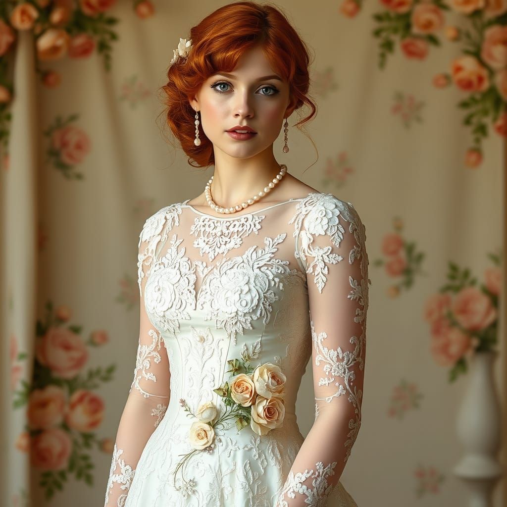 This image shows a red-haired woman in an elaborate lace wedding gown. The dress features floral designs, pearls, and embroidery in an art nouveau style.