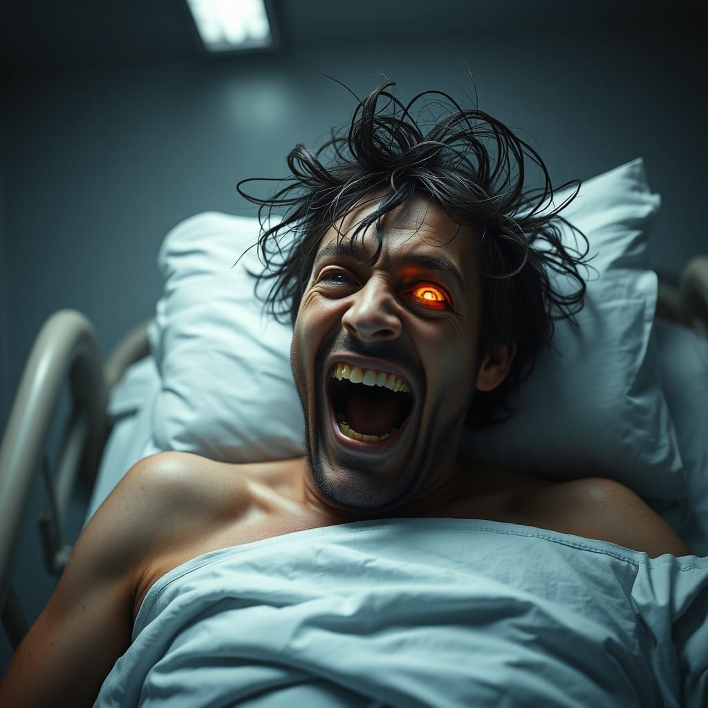 This haunting image captures a disheveled patient in a hospital bed, lost in uncontrollable laughter, surrounded by sterile hospital decor in a moody, cinematic atmosphere reminiscent of Francis Bacon's emotional intensity.