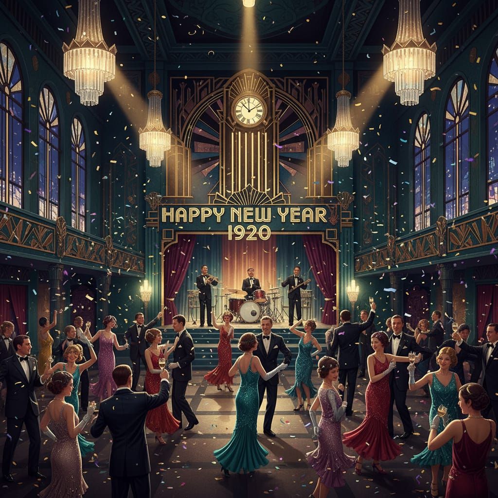 Generate your own stunning Art Deco New Year's party scenes with vibrant colors and dramatic lighting. It's free and easy!