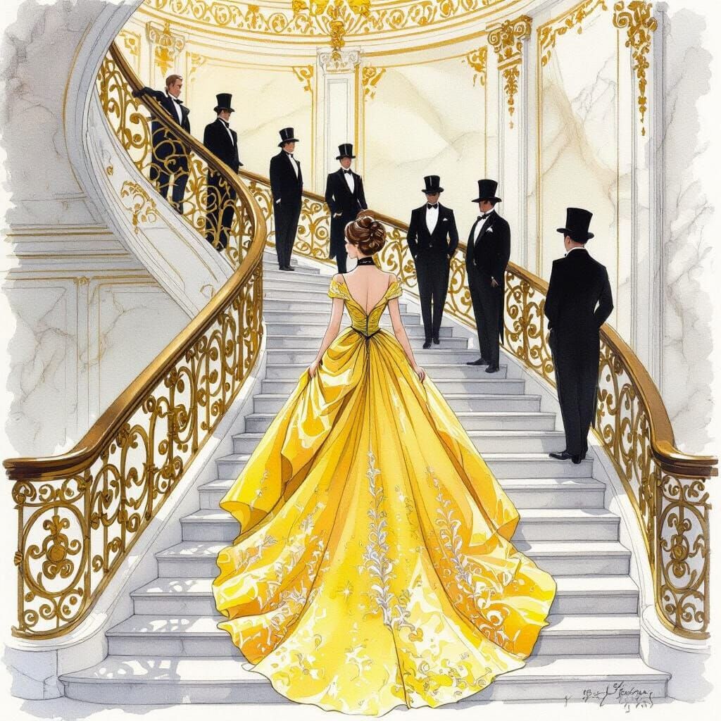 This image shows a woman in a yellow gown walking up a staircase towards a group of men. The illustration is rendered with watercolor techniques, creating a soft and ethereal aesthetic.
