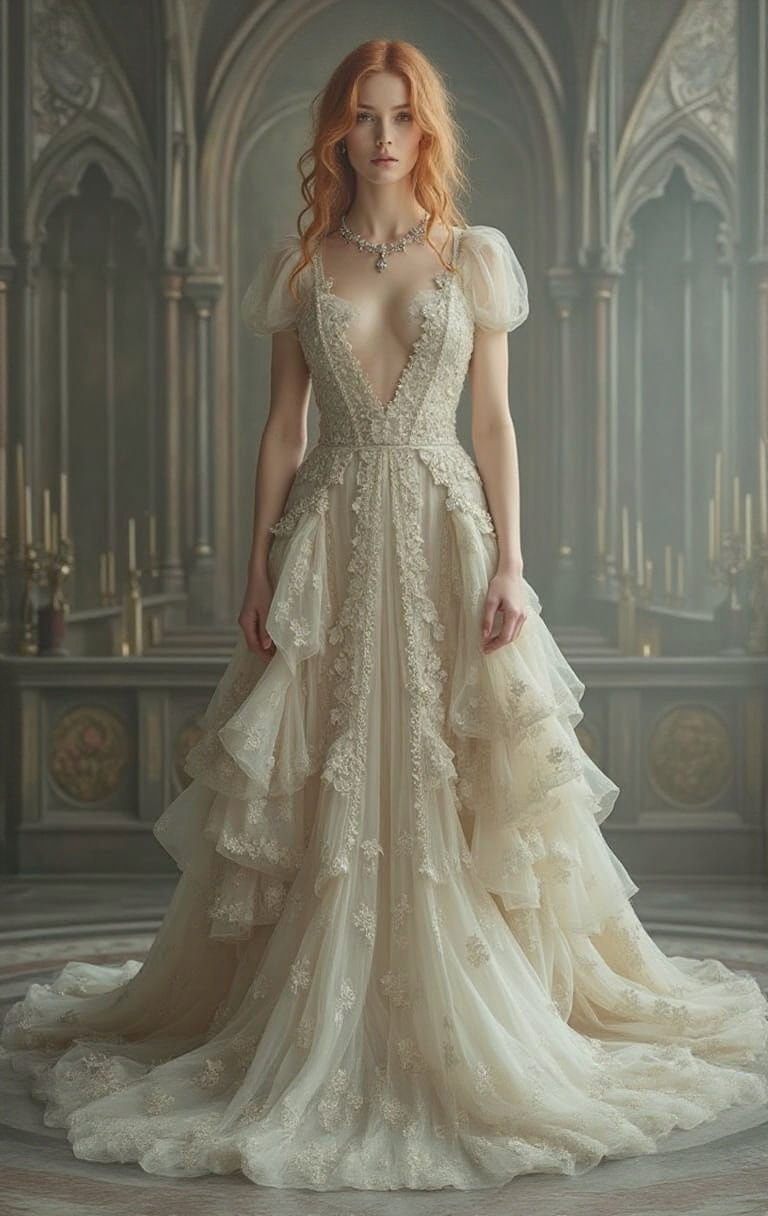 This image depicts a beautiful woman in a grand gothic cathedral, surrounded by opulent details and softbox lighting, reminiscent of Pre-Raphaelite art