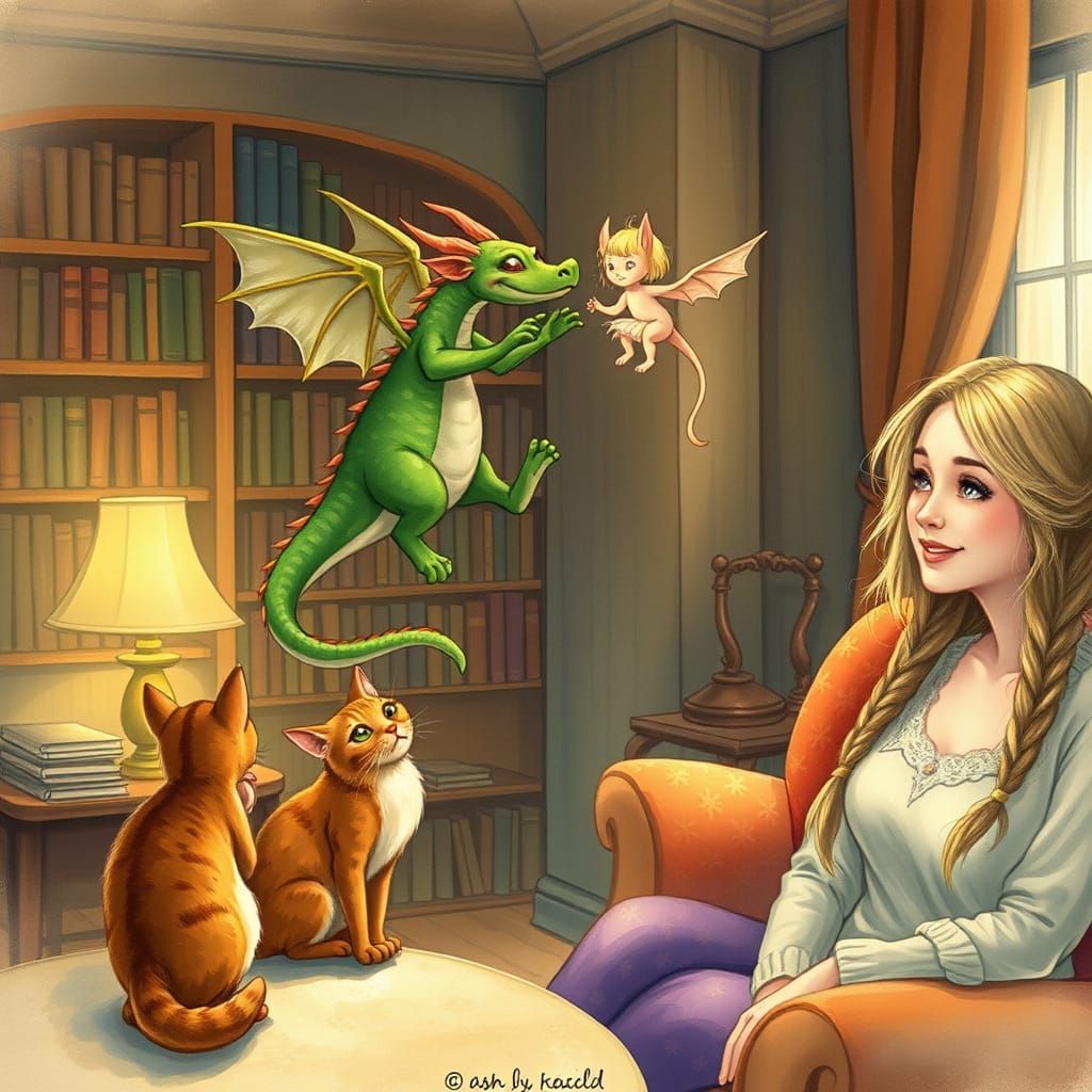 This enchanting image depicts a warm and cozy living room scene where a small, vibrant green dragon dances with a playful spirit, surrounded by the sweet scent of old books and the regal presence of a russet-colored cat. The scene is reminiscent of intricate textures and subtle color gradations, evoking ...