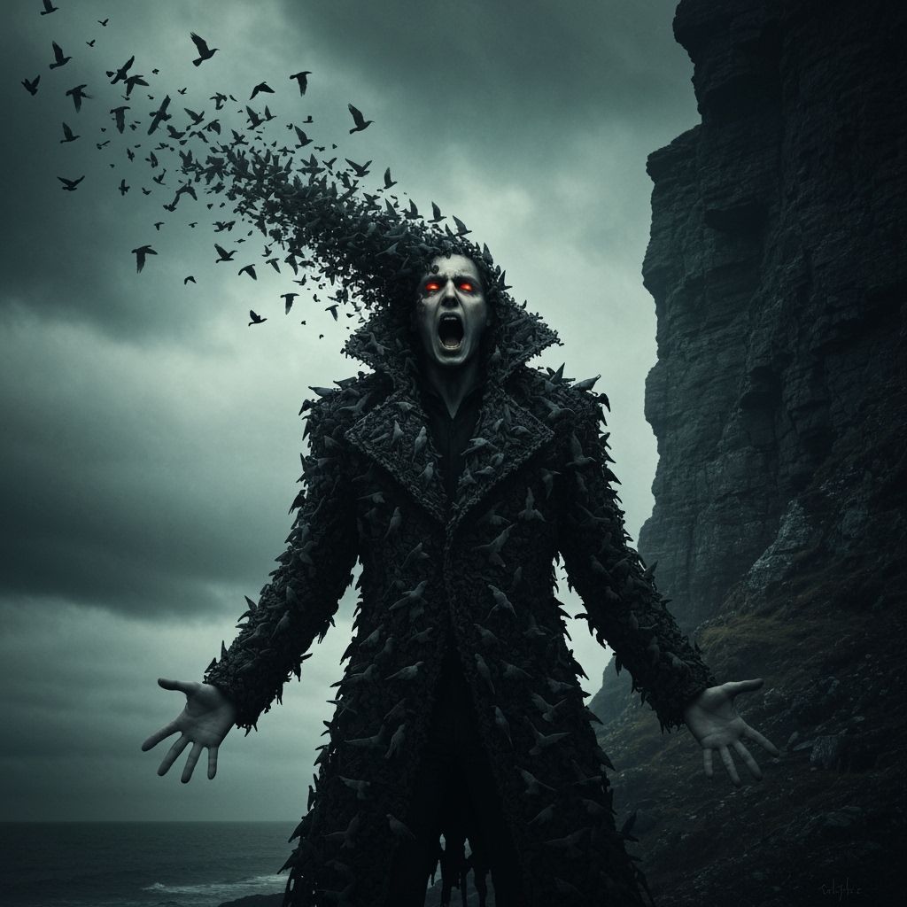 A dramatic image of a dark, bird-like figure screaming in agony against a cliffside. The gothic and surreal artwork features eyes blazing with inner turmoil as the figure dissolves into the sky.