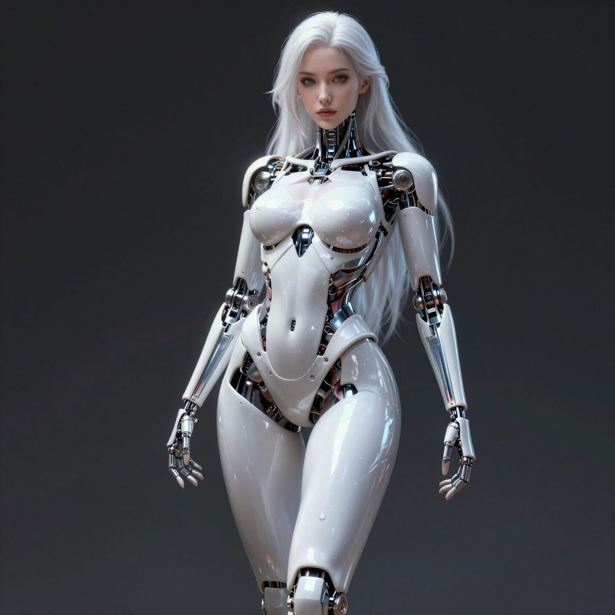 This image features a hyperrealistic portrayal of a feminine cyborg with an hourglass figure and metallic enhancements. Dramatic lighting highlights her form, blending organic curves with robotic details in a cinematic style.