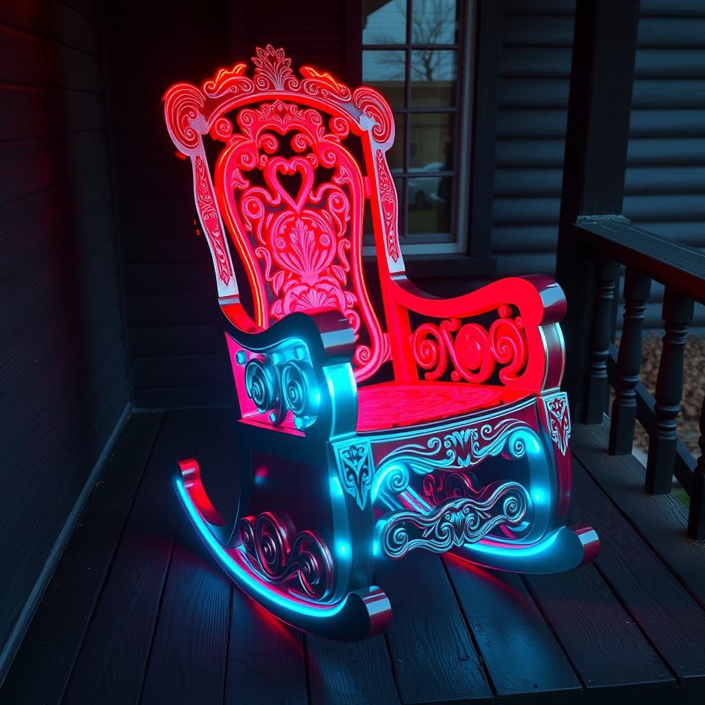 This image shows a neon red rocking chair with detailed carvings, placed on a weathered black porch to create contrast. It's a futuristic, avant-garde design with whimsical aesthetics.