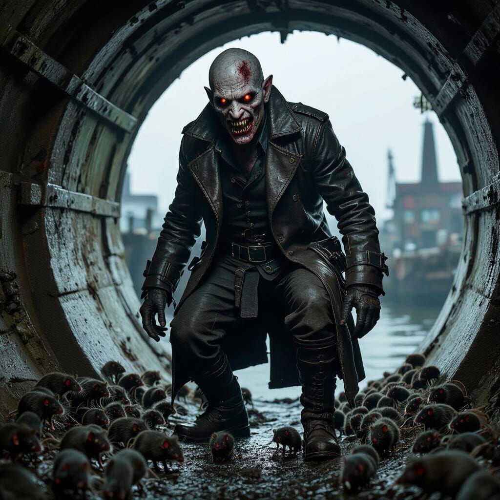 This 8k photograph captures a grotesquely deformed Nosferatu in a torn trench coat, surrounded by rats at a dark sewage tunnel entrance. Gritty urban horror with golden hour lighting and intense detail.