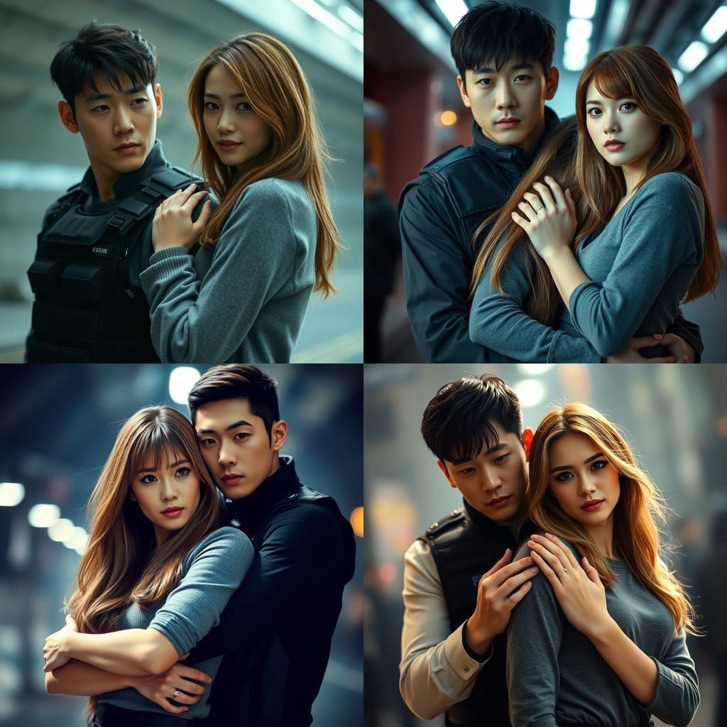 A cinematic film still captures a romantic moment between a Korean man and a woman with golden brown hair and blue eyes, shielded by him in a futuristic setting with a sci-fi background, shot on a high-end camera with film grain and vignette effects.