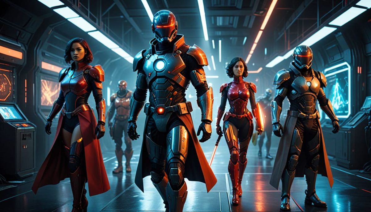 This image captures a diverse group of cosplayers in vibrant sci-fi costumes at a convention. Rendered in hyper-realistic digital art with neon lighting and metallic accents, it features dynamic colors and expressions of wonder.