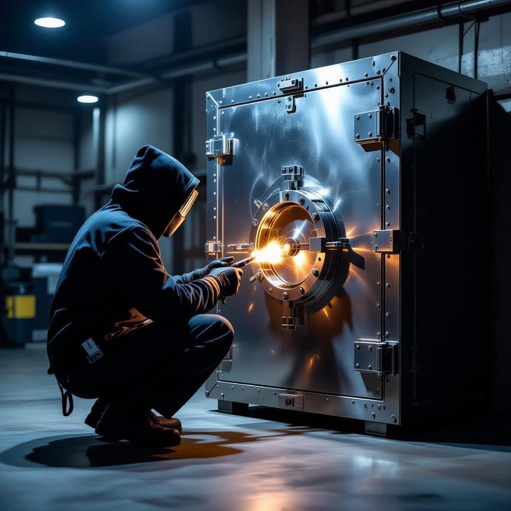 A thief in dark clothing uses a torch to cut open a large metal safe in a dark, industrial-style room, depicted with ultra-realistic reflections and details. The image is reminiscent of high-definition photography.