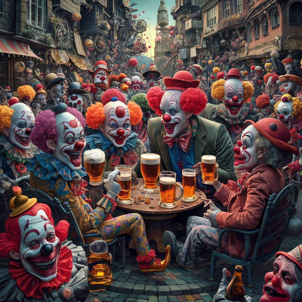 This image shows a cheerful clown festival in a busy square, with many clowns drinking beer. The artwork has lowbrow elements, intricate features, and a twisted fairytale aesthetic.