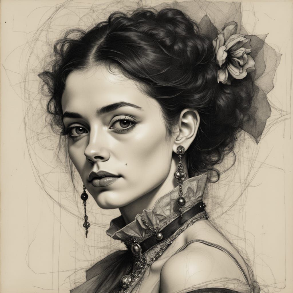 This image features a portrait of a beautiful Rococo Victorian woman, rendered in a gestural charcoal sketch style with loose, unfinished strokes. The artwork emphasizes natural dark colors and hyperdetailed linework.